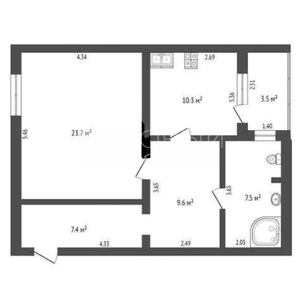 Планировка: Очень комфортная планировка, все помещения правильной формы. Просторная входная зона. Кухня 10,3 кв.м. с выходом на балкон 3,5 кв.м. Светлая спальня 23,7 кв.м. Совмещенный санузел 7,5 кв.м. Окна выходят на две стороны дома (распашонка), что обеспечит комфортные условия в жаркую погоду.