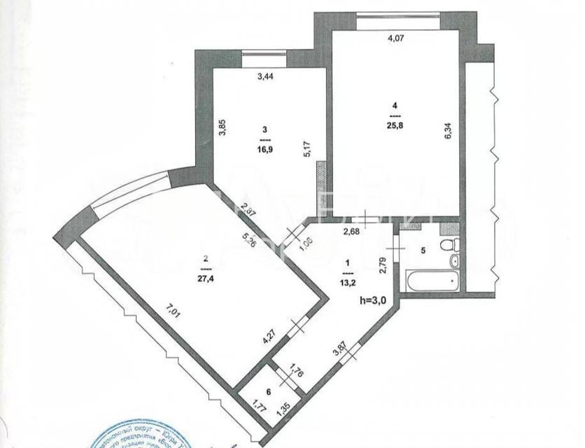 Планировка: Очень комфортная планировка. Просторная и светлая квартира. Уютная кухня-гостиная 16,9 кв.м. станет местом проведения семейных встреч и гостей. Две просторный комнаты по 25,8 кв.м. и 27,4 кв.м. Спальня зонирована, расположен кабинет. Совмещенный санузел 5 кв.м.Окна выходят во двор и на улицу, в квартире отличное естественное освещение.