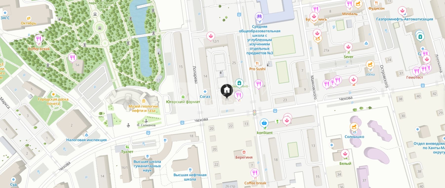 Инфраструктура: стоит отметить исключительно удачную локацию дома для спокойного проживания. Дом расположен в центральной части Ханты-Мансийска. Он прекрасно подойдет для проживания с детьми, так как здесь есть детские площадки для детей разного возраста. Рядом с домом хорошая развязка транспорта, продуктовые и хозяйственные магазины (Пятерочка, Магнит, Перекресток, Nebo и т.д.), аптека, салон красоты, банк, рядом остановки общественного транспорта, живописный природный парк Самаровский чугас.