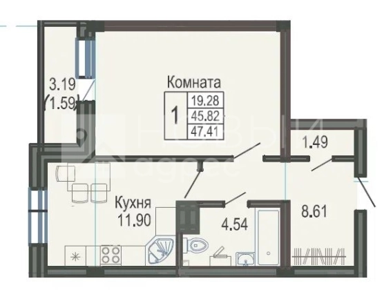 Планировка: просторная 1-комнатная квартира, общей площадью 46,3 м². Планировка квартиры продумана до мелочей для Вашего комфортного проживания в ней, она включает в себя: просторную кухню 11,9 м², где вся семья будет проводить свободное время вместе; очень просторная комната 19,3 м²; высота потолков 2,8 м; совмещенный санузел; просторный.